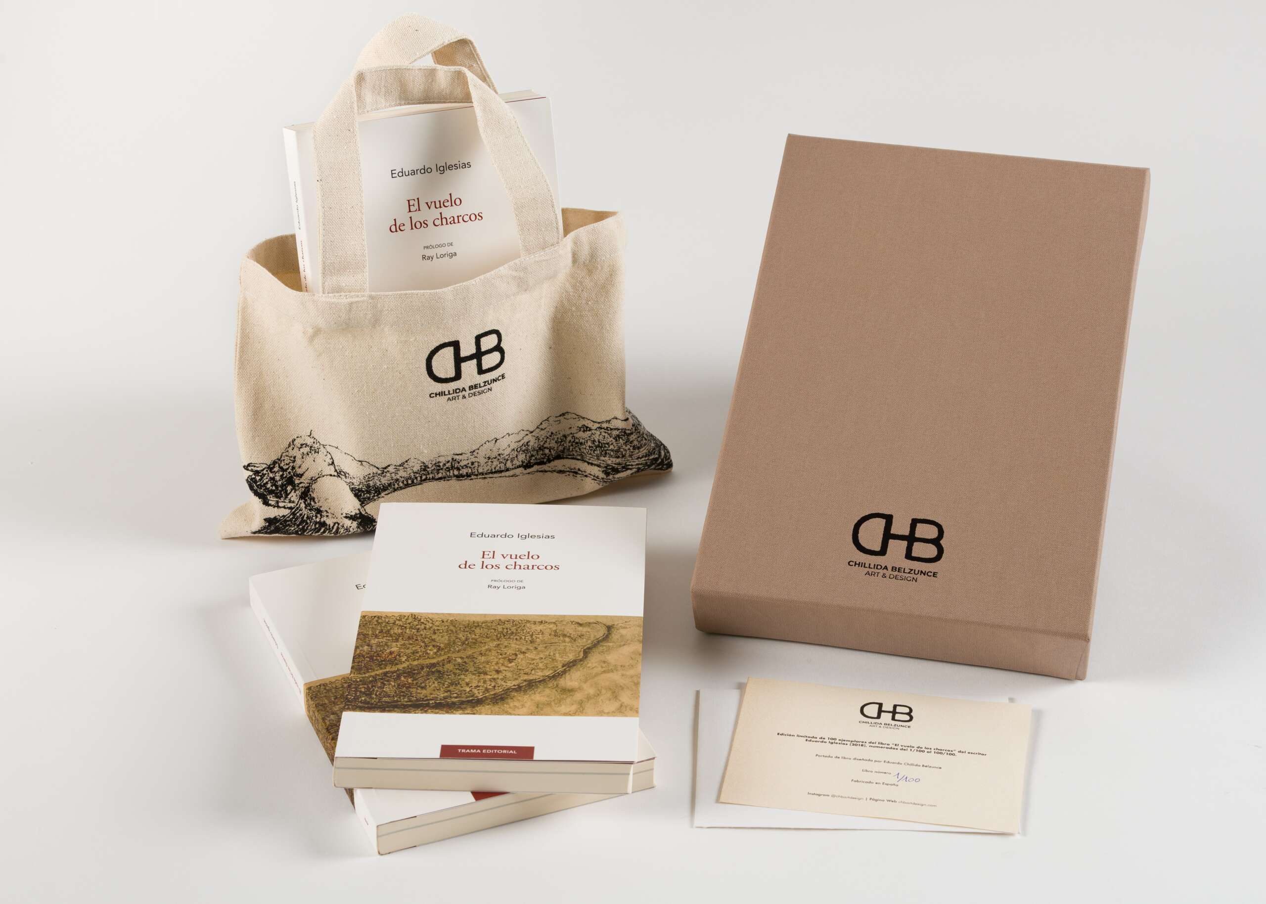 Hemos creado un packaging exclusivo que refleja el valor y la esencia de nuestro producto. Cada unidad va presentada en una bolsa de algodón 100% natural, ilustrada con una obra original de Chillida Belzunce, y se entrega en una caja de cartón forrada a mano, cuidando cada detalle para ofrecer una experiencia única desde el primer momento.